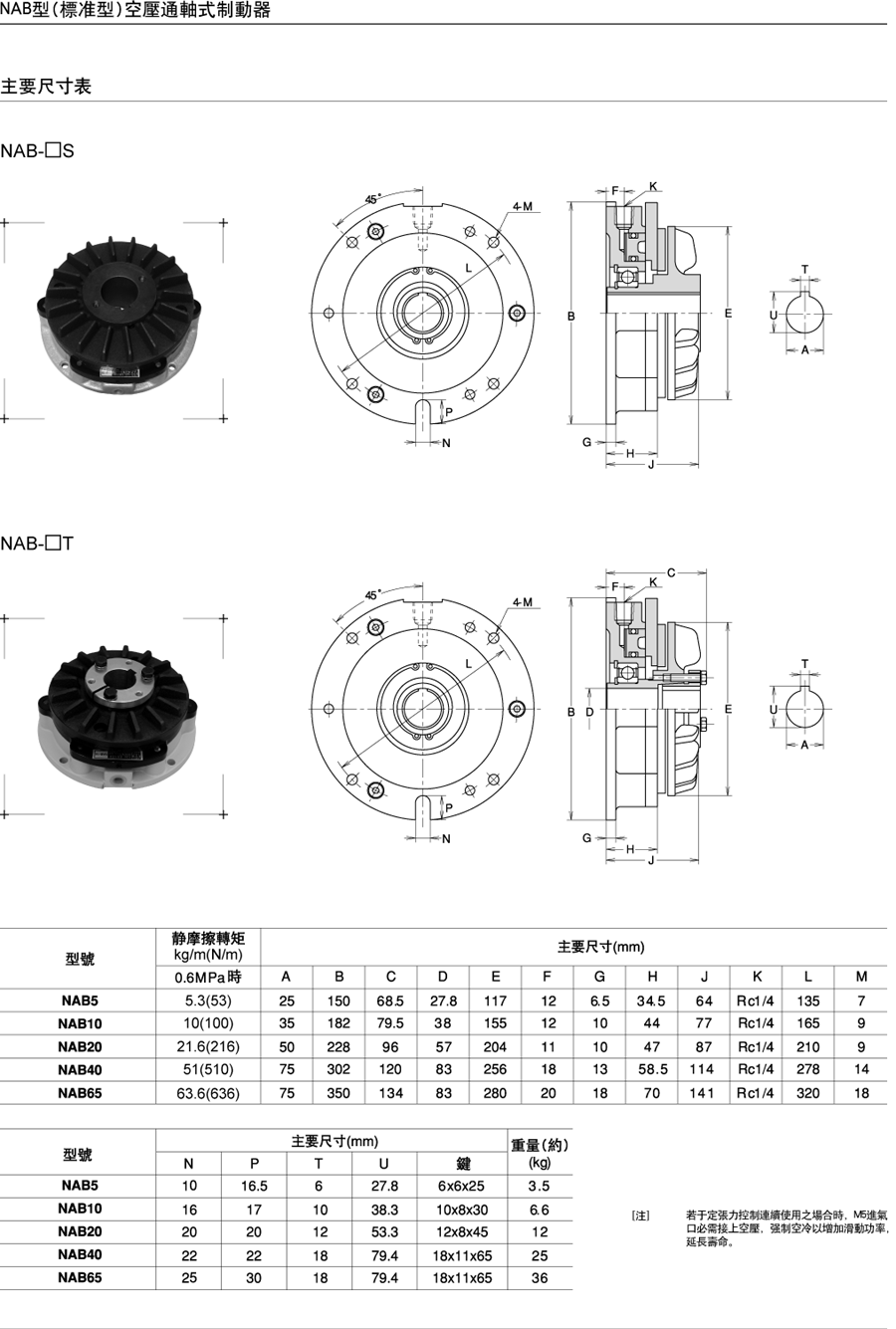 NAB型(标准型)空压通轴式制动器,是用带楔的圆锥形轴套管往轴上安装,拥有摩擦板可在保持机械设备原样的情况下进行交换的构造。靠安装在带轮毂的圆盘上的冷却片来散发因摩擦而产生的热量。摩擦板是双切口对开式,通过带轮毂圆盘的孔,用螺丝刀把埋头螺钉取出来后即可交换摩擦板。