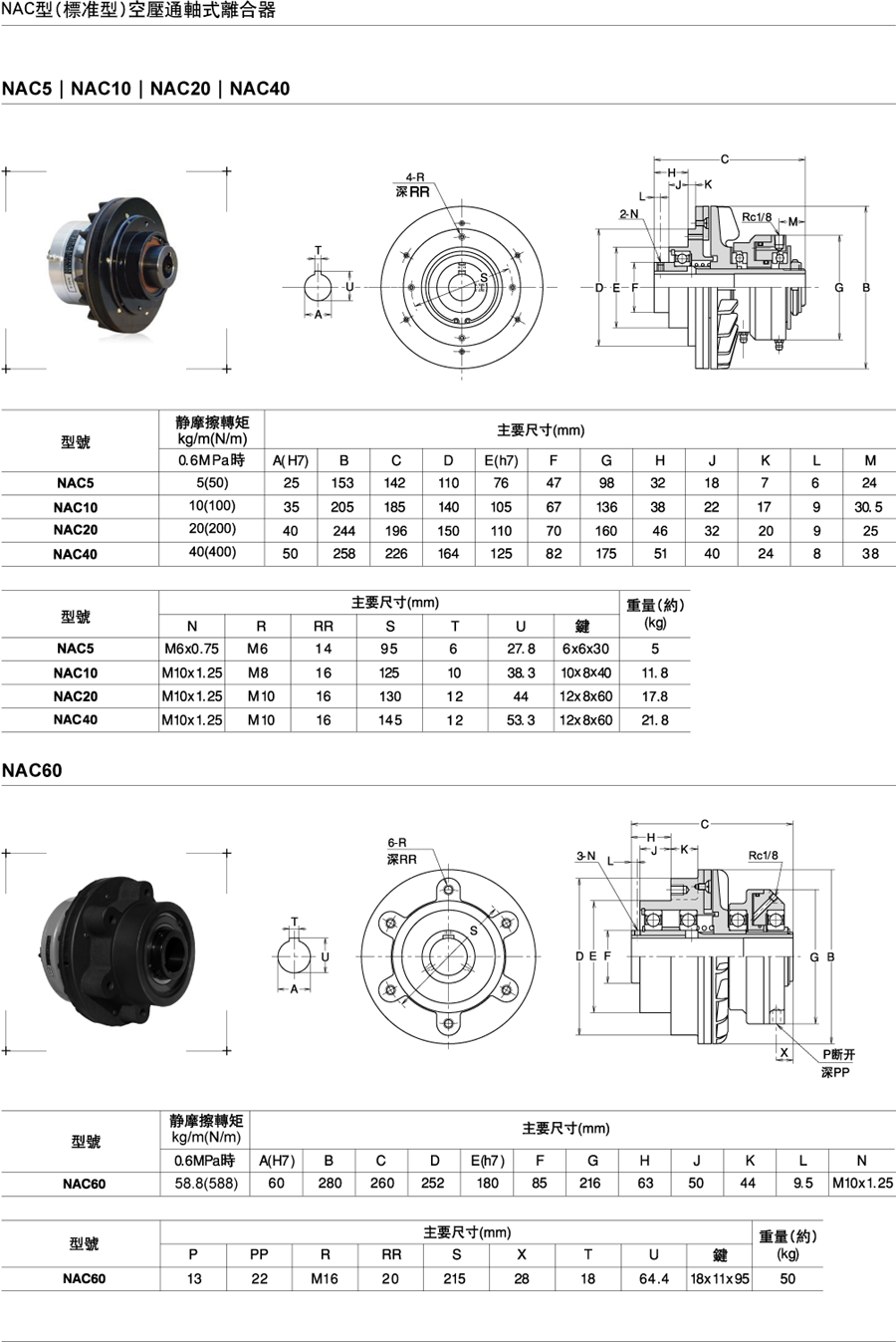 NAC型(标准型)空压通轴式离合器靠空压来连结,靠复归弹簧来放开。圆盘靠空气压沿轴方向滑动,接触摩擦板。圆盘、摩擦板等,被组装到轮毂上,成为一体化构造。摩擦板可用拧开调整螺帽的方式进行分解,交换简单。