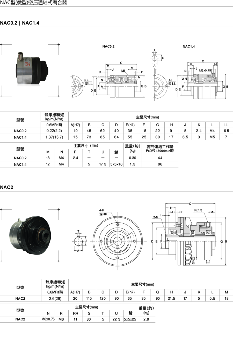 (微型)把NAC(标准型)小型化,省资源,省空间微型产品。微型空压离合器把标准型空压离合器所有特长吸取进来,再进一步轻量化,小型化。是所有机械小型化设计之必需制品。